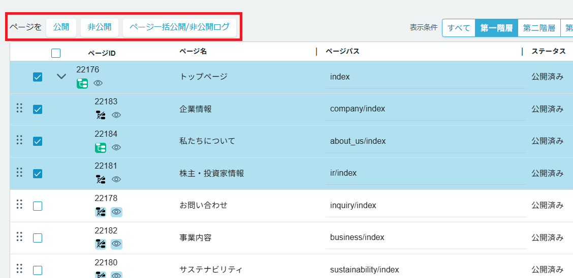 ページ一覧画面に、ページごとのチェックボックスが表示されます。チェックを付けた状態で「公開/非公開」ボタンをクリックすると、選択したページをまとめて公開・非公開にできます。