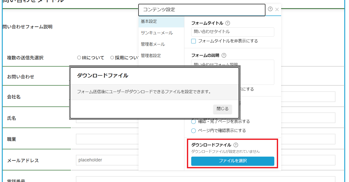 フォーム送信後に表示される問い合わせ受付完了ページに、ダウンロード資料を設置できるようになりました。
