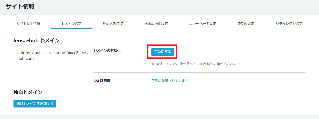 独自ドメインを追加しただけでは、LENSAhubで独自ドメインを利用できません。
