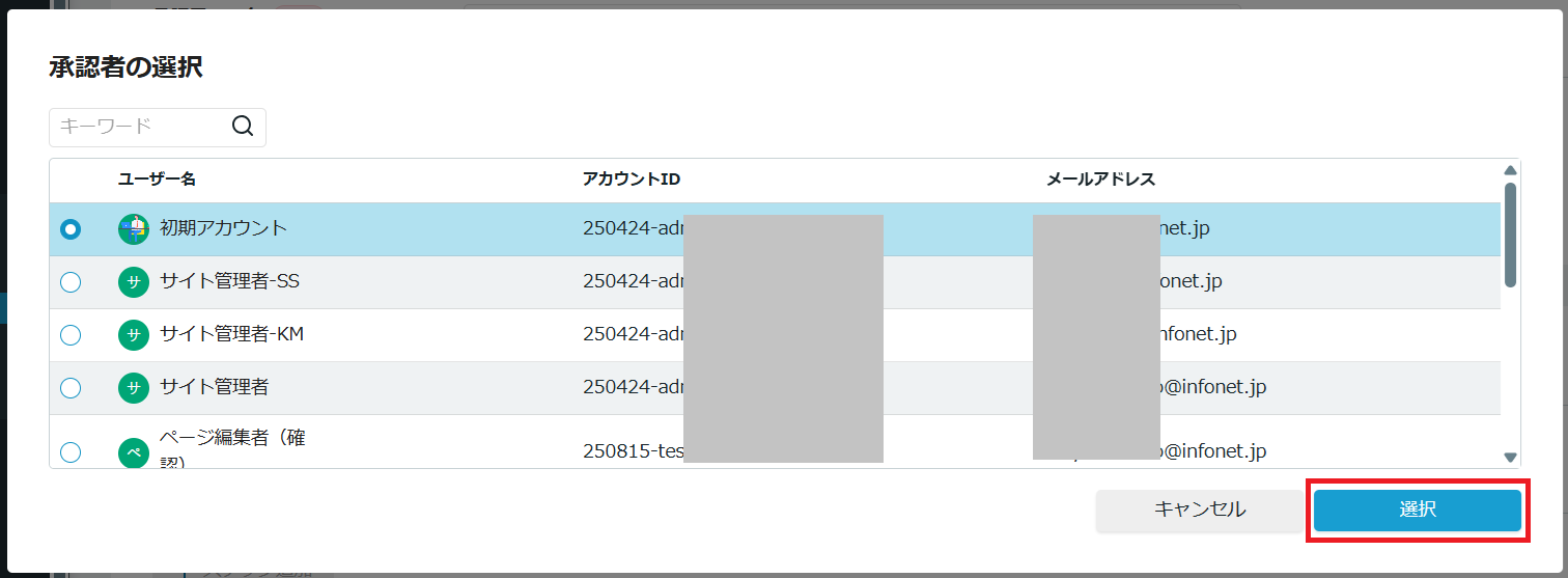 承認者として設定したいユーザーにチェックをつけ、「選択」をクリックします。