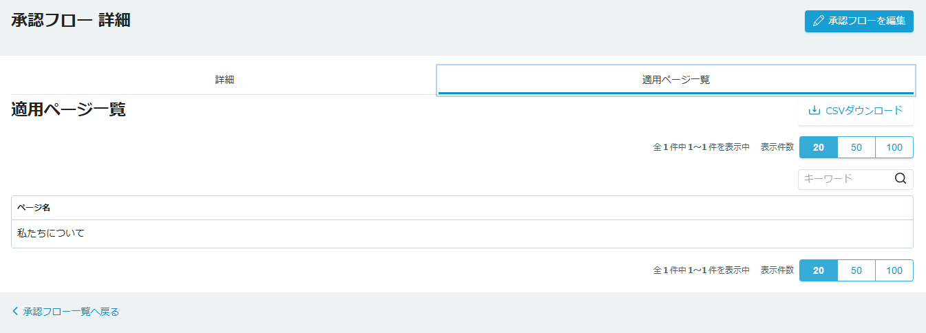 該当の承認フローが適用されているページ一覧を確認することができます。