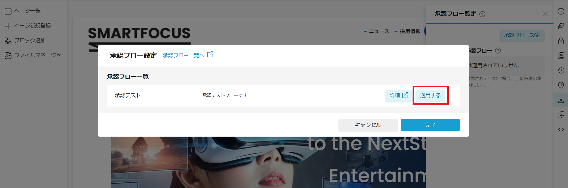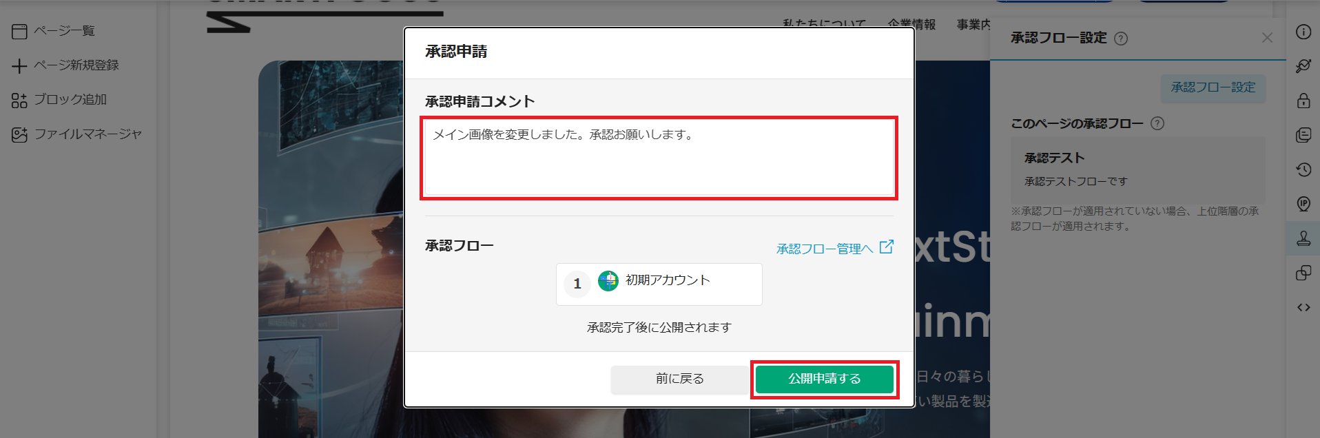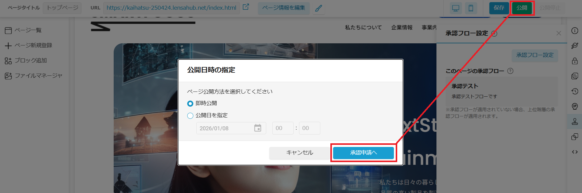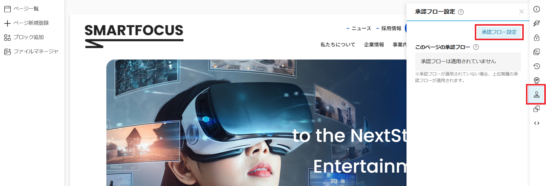 承認フローを設定したいページの編集画面から、承認フローの設定を行うことができます。 承認設定をすることで、ページの公開や非公開を行う際に、承認申請を依頼するフローを適用できます。