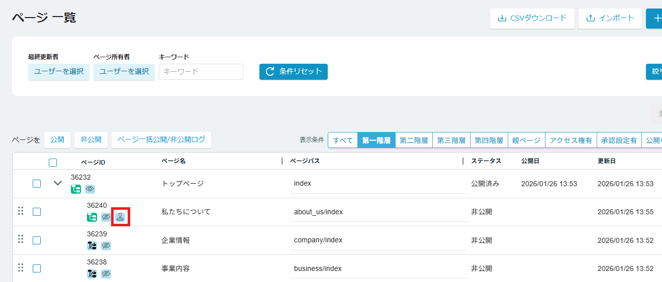 承認フローが設定されているページはページ一覧よりアイコンで確認することが可能です。 アイコンをクリックすると承認フロー詳細画面を確認することができます。