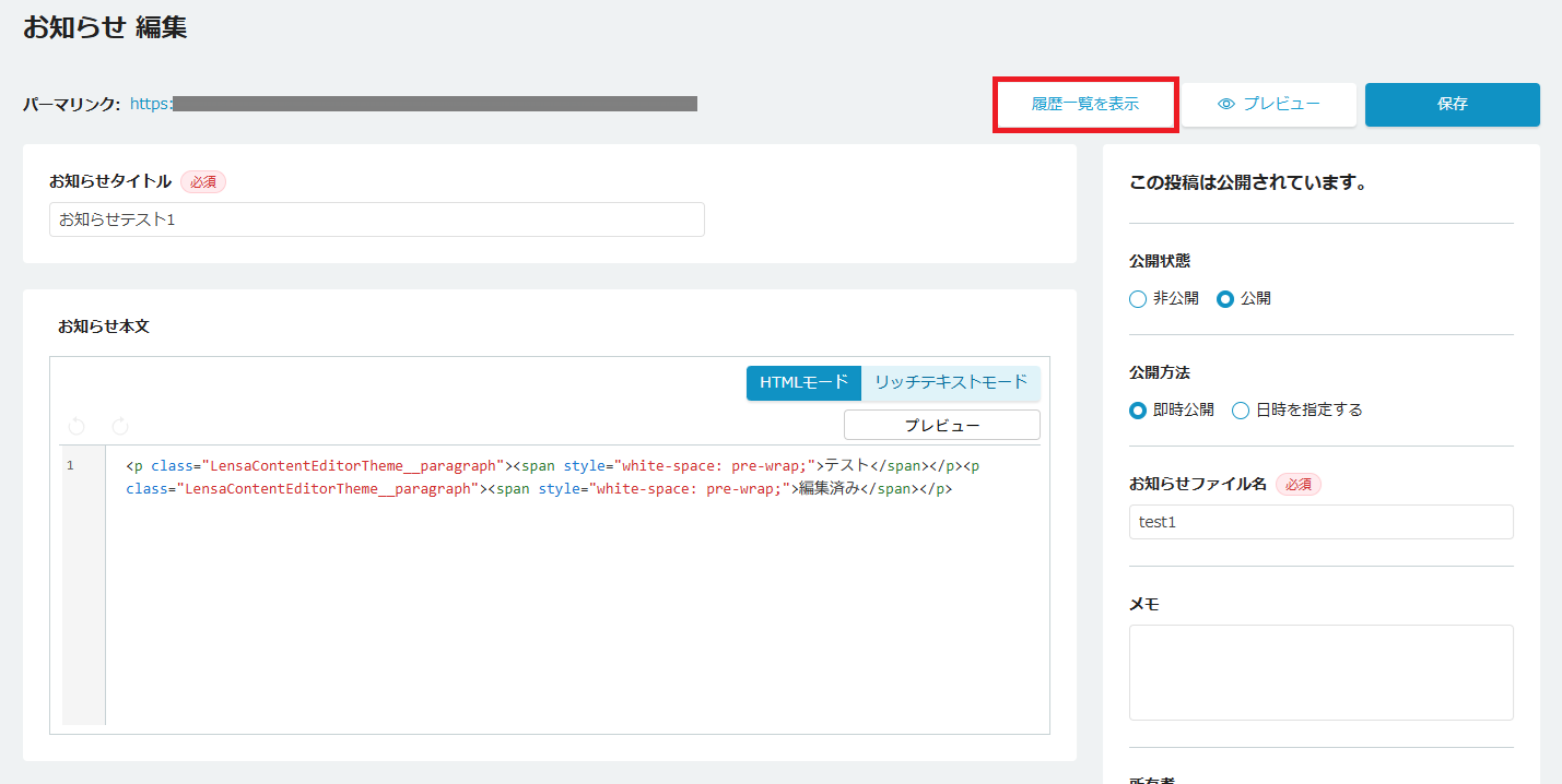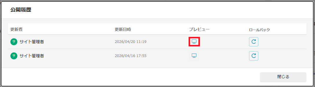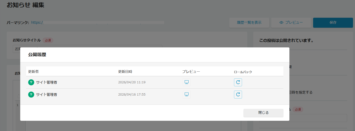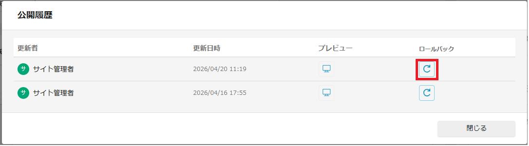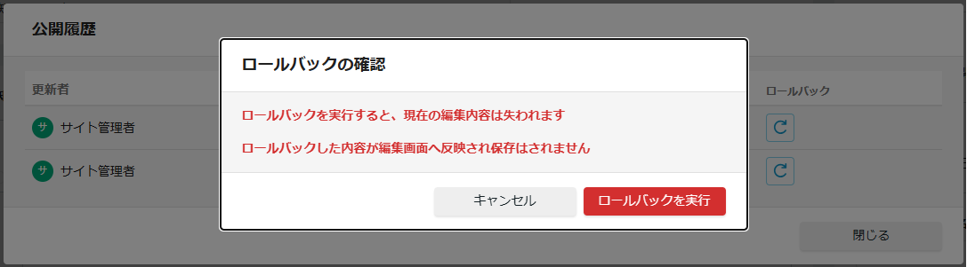 履歴一覧を表示から「ロールバック」を選択することで、これまでの公開履歴を確認し、過去の任意のバージョンへ内容を差し戻すことができます。 誤って編集・公開してしまった際や、以前のコンテンツを再利用したい場合に、迅速かつ正確にページを復元することが可能です。