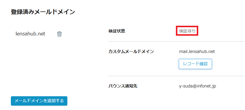 DNSレコードの登録作業が完了しても、LENSAhub上のステータスはすぐに「検証済み」にはならず、以下の画像のように「検証待ち」という状態が継続します。