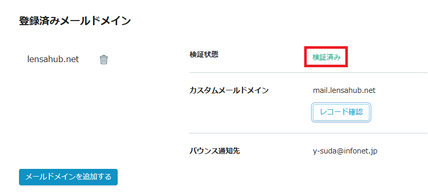 ステータスが「検証済み」に変われば、メールドメインの設定はすべて完了です。