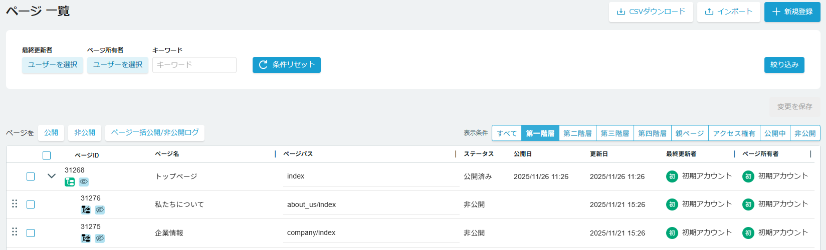 ページ一覧の情報をCSVファイルにてダウンロードすることができます。