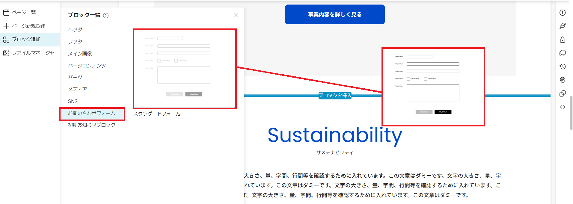 フォームを設置したいページのブロック一覧から「お問合せフォーム」を選び、好きな場所にドラッグ&ドロップしてください。