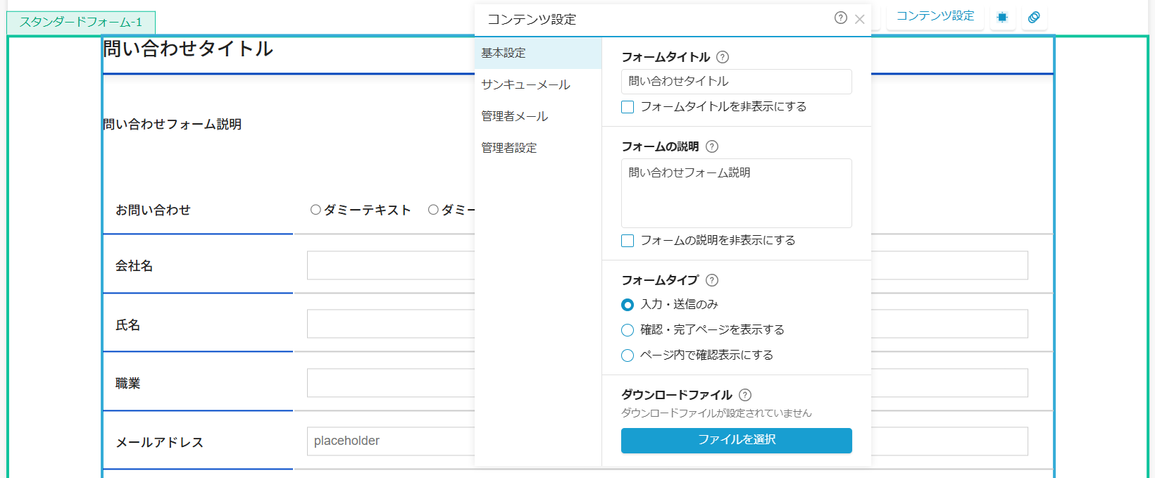 「コンテンツ設定」では、フォームの管理部分を変更できます。
