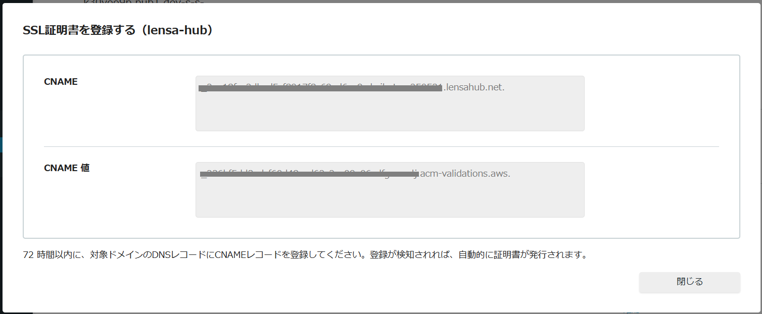 LENSAhubでSSL証明書を発行する場合、CNAME確認をクリックすると、「CNAME」と「CNAME値」というランダムな文字列コードが発行されます。 「CNAME:ホスト名」、「CNAME値:指定先」となり、この値をそれぞれ「DNS登録」の時と同じ手順で登録していく必要がありますが、登録するドメイン事業者によっては以下の注意が必要です。
